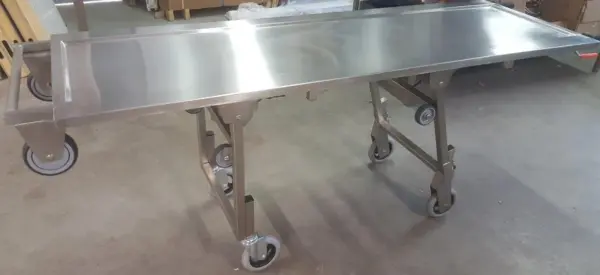 Brancard pour caisson 1 corps standard ou obèse Réf. 4400/60 :et pour caisson 2 corps et Réf. 4400/50 . Tout inox 304, en tube de 1,5mm offrant une grande solidité à l’ensemble, renforcé et repliable. Son plateau civière est incurvé (20mm) pour faciliter la rétention des liquides. Il possède 2 poignées de tirage (une de chaque côté) et 2 poignées côté manœuvre pour actionner le déblocage des 2 pieds à roulettes amovibles. Ses 2 piètements sont repliables grâce à des compas à gaz. Il possède 4 roues de ? 15cm dont 2 fixes et 2 pivotantes. Il est équipé de 2 sangles à fermeture et ouverture rapide pour le maintien du corps pendant les transferts. Inclus : 2 freins pour blocage du brancard à l’opposé des poignées et en option possibilité de mettre un blocage sophistiqué.