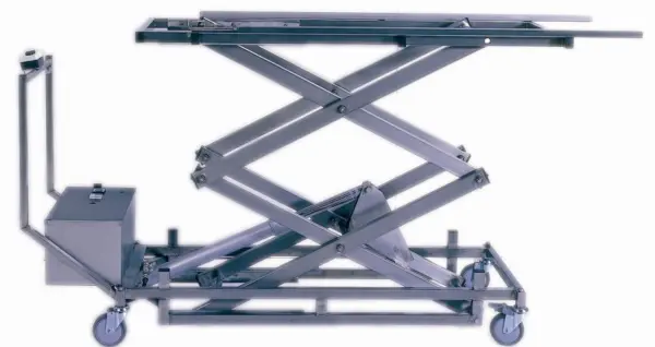 Tout inox 304 finition inox brossé avec Système de levée à double croisillon apportant robustesse et rigidité, et l’élévation se fait par un vérin hydraulique. Avec sa commande électrique, fixée au chariot, les manœuvres sont facilitées. Il possède une batterie rechargeable à solution acide et un chargeur intégré. Il possède un freineur pour régler la vitesse de descente. Empattement optimisé : avant – arrière 145 cm et gauche – droite 50cm – Vérin hydraulique très silencieux – Une fin de course haute et basse – Une sécurité de blocage sur vérin – 4 roues pivotantes de ? 12,5cm dont 2 avec frein – 2 rails pour civières à roulettes – Rails avec butée de fin de course et un système de blocage à ressort permettant de bloquer la civière sur le chariot. Garde au sol réduite (6 cm) – Stabilité parfaite pendant la manœuvre des défunts (avec les 2 roues avec frein, bloquées). DIMENSIONS : Largeur 65 cm x Longueur 220 cm x hauteur variable (mini 32 maxi 190cm) – Charge admissible 250 Kg – Poids : 115 Kg.