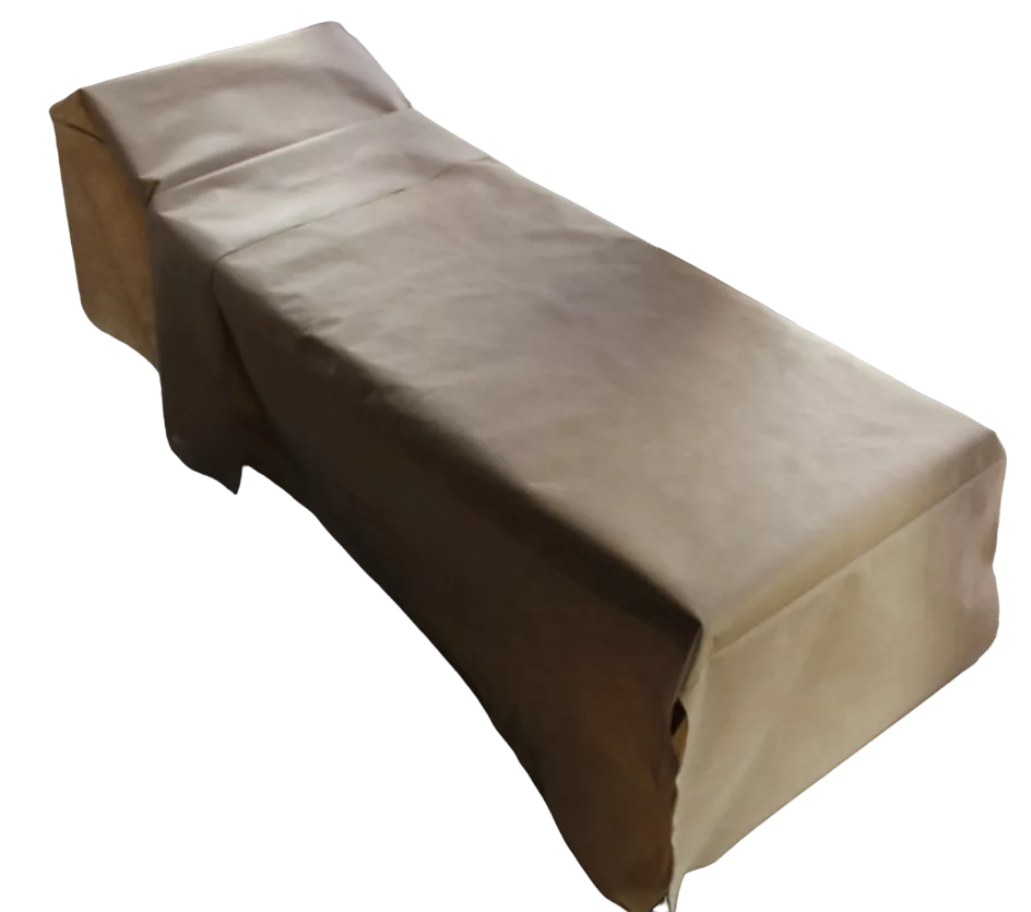 Habillage à usage unique couleur camel pour table réfrigérante.