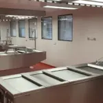 Table réalisée réalisée en inox 316, à hauteur variable 73 à 103 cm. 1 plan de travail d’épaisseur 20/10°, lisse sans trous, équipé d’un rinçage permanent réglable en débit. Le plateau est légèrement incliné et permet l’évacuation des liquides, et troué en périphérie pour faciliter l’extraction d’air grâce à son moteur indépendant équipé de 2 filtres. Un pied de largeur 72cm et de longueur 142cm lui confère une grande stabilité. Elle est équipée d’un bac 40 x 40 x 20cm (haut) avec mitigeur EC/EF à commande au coude, une douchette avec flexible longueur de 4m, un robinet rinçage permanent, une surverse, bonde et siphon, une prise électrique 230V/50Hz protection IP55, et 3 supports de corps. Aspiration centralisée ou intégrée avec caisson de filtration désinfection (Réf. 501120) : un système d’aspiration (400m3/h) des poussières et des odeurs peut être intégré à la table, ce qui permet de renvoyer l’air dans la salle après traitement sur un pré filtre granulométrique EU2 et un filtre à charbon actif à 200g/m3. Charge admissible 300 Kg. Dimensions : L 290 x H 73 – 103 x l 80 cm (variante 90 cm)- course de 30cm – Poids 220 Kg.